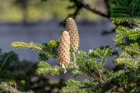Afternoon Korean green fir with cones on a branch in the forest close-up.