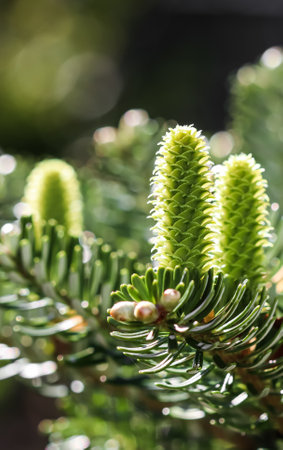 Korea fir, Abies koreana, pollinating female cones, close up,