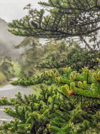 A branch of Korean fir with cones and raindrops on blurred background
