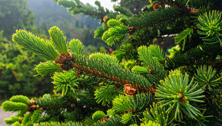 Green spruce branches with cones close-up on a blurred background