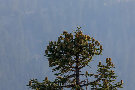 A high elevation Shasta Fir tree is decorated with large cones growing up from the branches with a forest background and thick smoky air from a nearby forest fire.