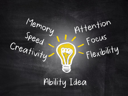 Ability Idea Concept (memory,speed,creativity,attention,focus,flexibility), teamwork motivation concept, white chalk handwriting on blackboard.