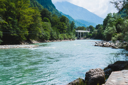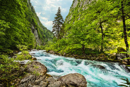 A turquoise river flows between green mountain slopes. The water is foaming. Trees grow on the rocky island. Summer sunny day. Abkhazia