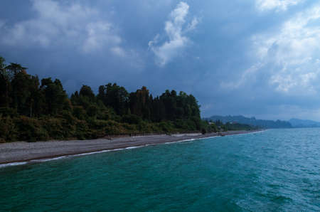 Turquoise sea and dramatic clouds on a stormy sky before rain. Storm over the sea. Beach in Batumi, Georgia.