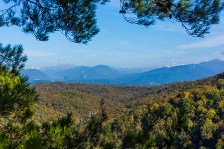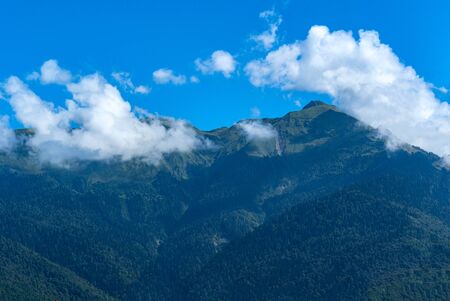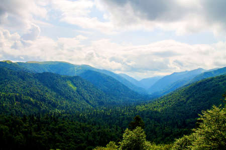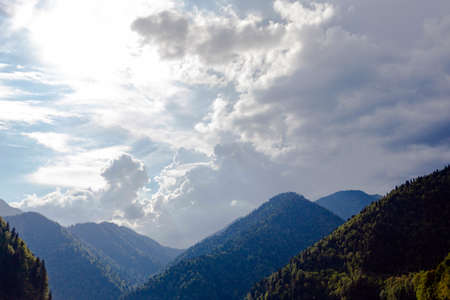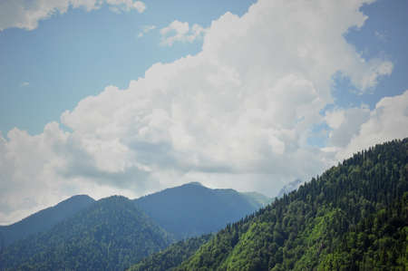 Beautiful view of the mountains with big clouds in blue sky. Krasnodar area, Sochi