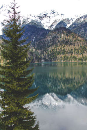 Abkhazia, Lake Ritsa, March 2015: Tall green coniferous tree against the background of Lake Ritsa and snow-capped mountains. Mauntains reflicted in water.