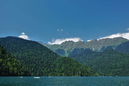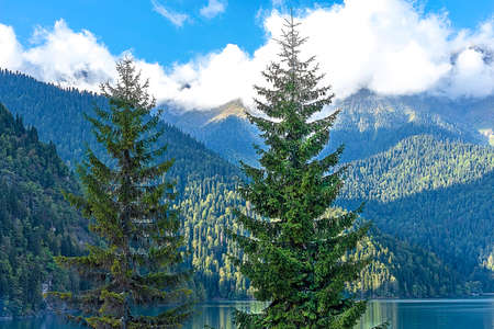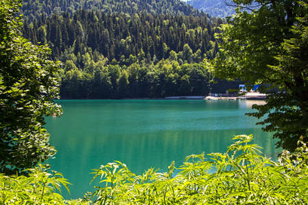 Lake Ritsa is a lake in the Caucasus Mountains in Abkhazia region. Summer bright landscape.