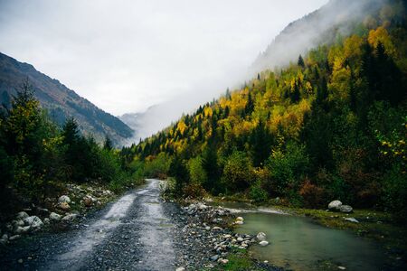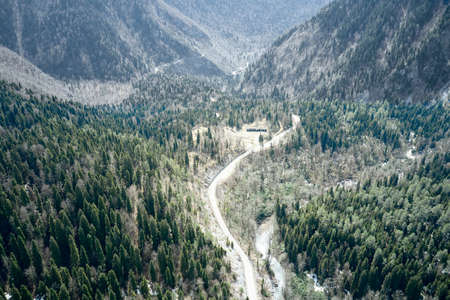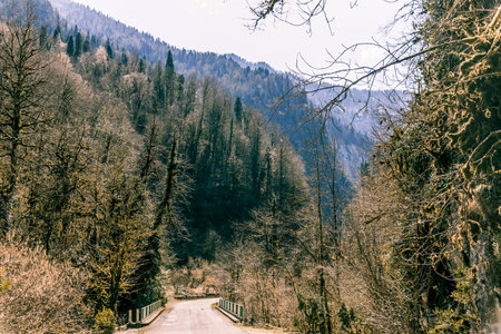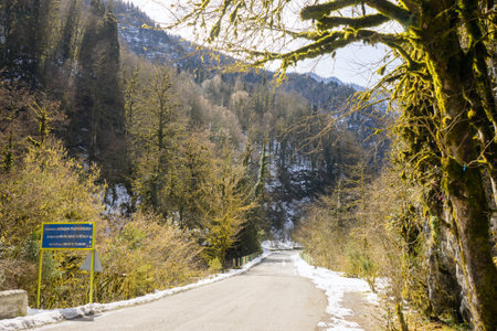 Mountain road in early spring in Abkhazia near the waterfall Men's Tears