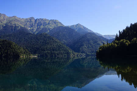 Lake Riza sorrounded with high caucasus mountains mirroring in the water