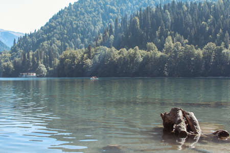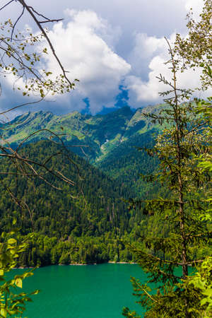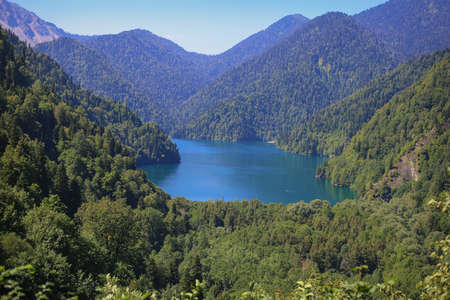 Beautiful mountain Lake Ritsa. Lake Ritsa in the Caucasus Mountains, in the north-western part of Abkhazia, Georgia, surrounded by mixed mountain forests and subalpine meadows.