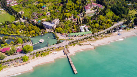 Amazing nature landscape view of lake Ritsa, Abkhazia Aerial view resort town Gagra, Abkhazia, Georgia