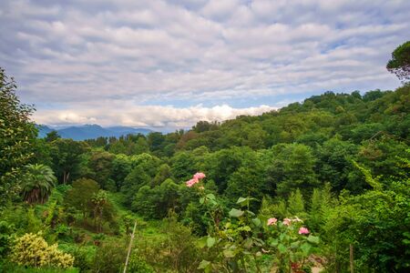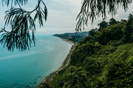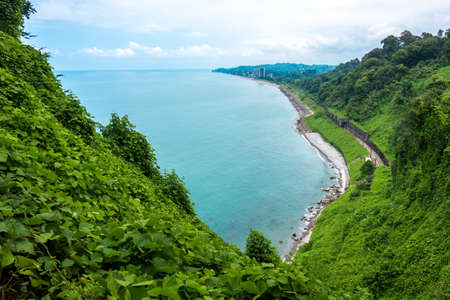 Beautiful view of the sea coast from the mountain. Botanical garden in Batumi