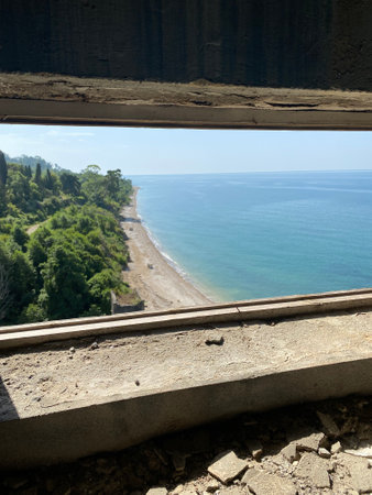 Magic Botanical Garden in Batumi, Georgia. view of the coast through the branches of trees