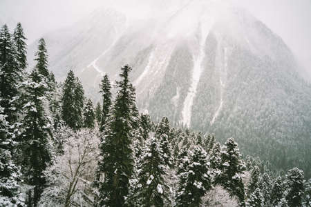 Pine trees in the snow in the mountains in Dombay Caucasus