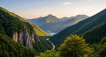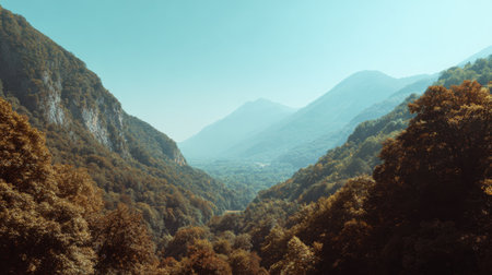 This stunning mountain valley scene captures the essence of nature with its vibrant greenery and soft blue sky, offering a serene escape into the great outdoors.