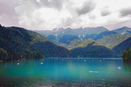 White boats float on the turquoise alpine lake Ritsa. On the banks there are mountains overgrown with coniferous forest. There are cumulus clouds in the bright blue sky. Abkhazia