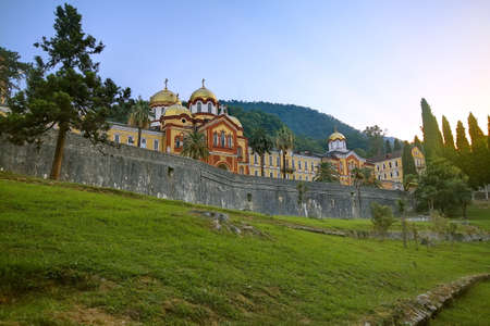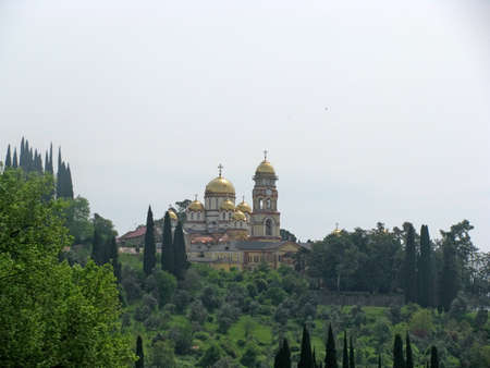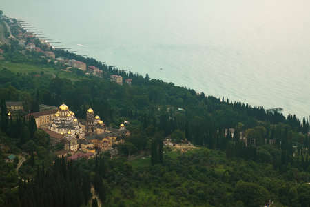 Top view of the New Athos Monastery and the city of New Athos on the seashore.
