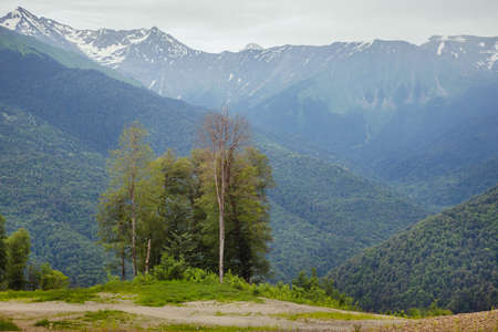 Beautiful natural background with Caucasus mountains. Group of trees on gren hill