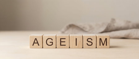 Wooden alphabet blocks spelling ageism appearing on a light wooden table against a subtle textured background, representing the concept of discrimination based on age