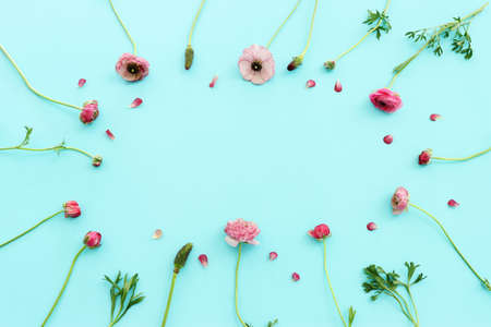 Tender ranunculus flowers in vase on pink background with copy space. Bunch of Persian buttercup in floral arrangements, top view, banner size