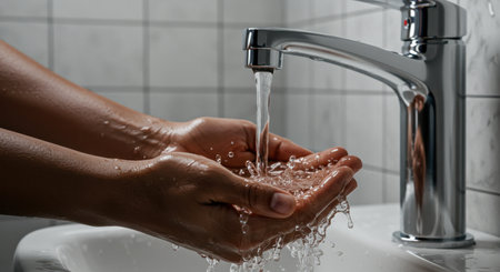 Water cascades over hands, emphasizing the importance of cleanliness and hygiene while washing in a bright, tidy environment.