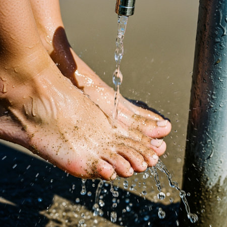 High-contrast Dutch angle detail of bare feet covered in sand being washed by water from an outdoor