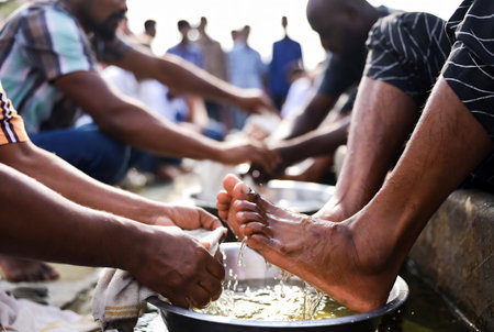 The man washing his foot preparing for the pray. Taking ablution before the praying