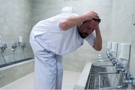 A young Muslim man cleansing his face in the mosque