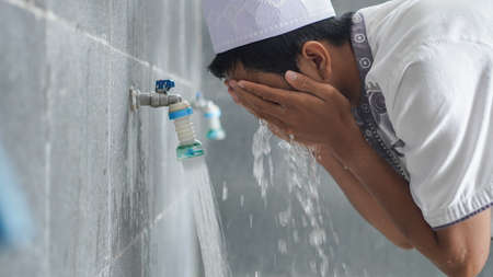 Muslim man taking ablution for prayer. Islamic Religious Rite Ceremony Of Ablution. Young Muslim man perform ablution (wudhu) before prayer.