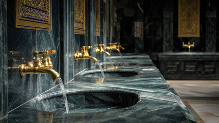 This stunning image captures elegant marble wash basins with golden faucets in a luxurious interior design setting, showing exquisite craftsmanship and modern aesthetics.
