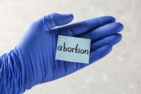 Doctor holding paper card with word ABORTION on light gray background, closeup. Space for text