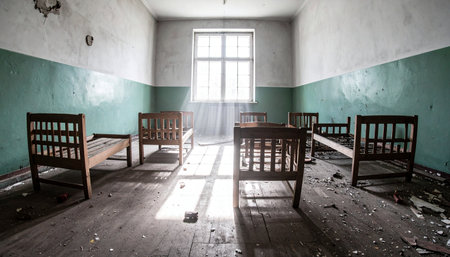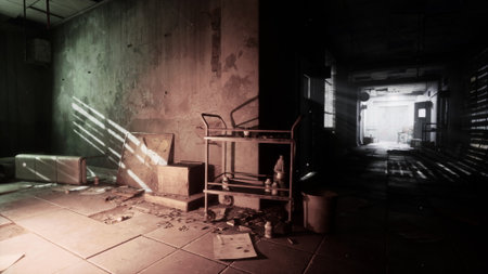 In a dimly lit corridor, faded walls reveal peeling paint. Scattered debris and a cart add to the eerie atmosphere, highlighting signs of neglect and abandonment in this forgotten space.