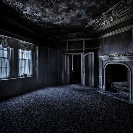 A dimly lit room with a blank wall in the background, creating a mysterious and atmospheric feel. Perfect for showcasing products, displaying artwork, or creating a moody backdrop.