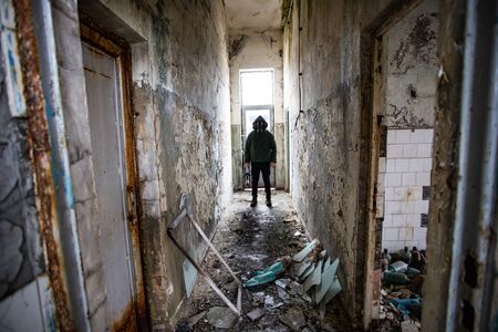 Post apocalyptic survivor in gas mask in a ruined building. Environmental disaster, armageddon concept.