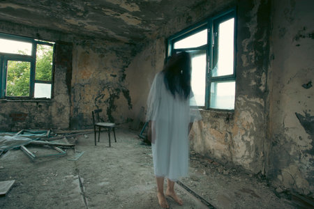 Ghost in abandoned, haunted house. Horror scene of scary spirit of a woman, halloween concept.