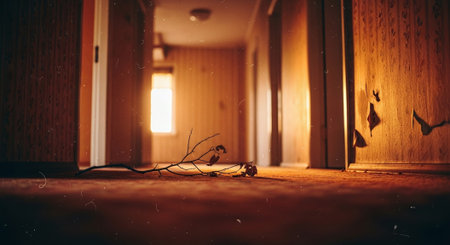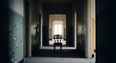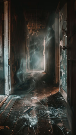 Spooky abandoned house hallway featuring dimly lit wooden floorboards, cobwebs, and eerie open doors. Concept of Halloween, horror, haunted mansion, mystery, scary atmosphere, abandonment. Vertical.