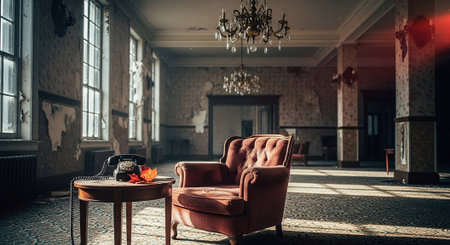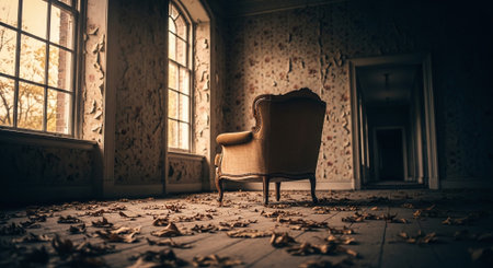 Eerie Abandoned Mansion Hallway with Crumbling Floorboards and Faded Furniture, Illuminated by Sunlight. Concept of Decay, Antiquity, Haunting Atmosphere, and Abandonment, Halloween.