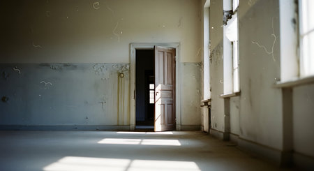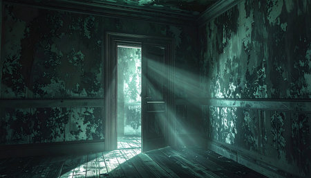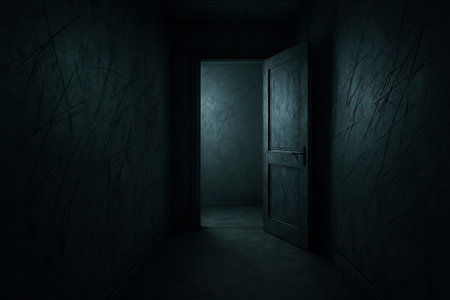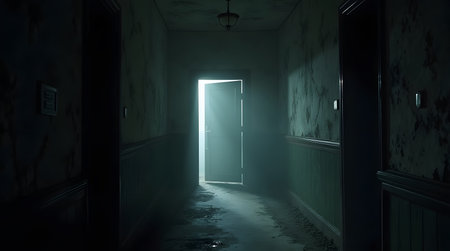 Dark narrow hallway with deep scratches on walls and mysterious open door emitting cold light. Concept of haunted house, horror suspense, Halloween fear, paranormal activity, eerie atmosphere.
