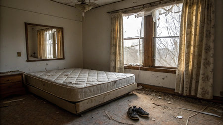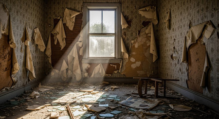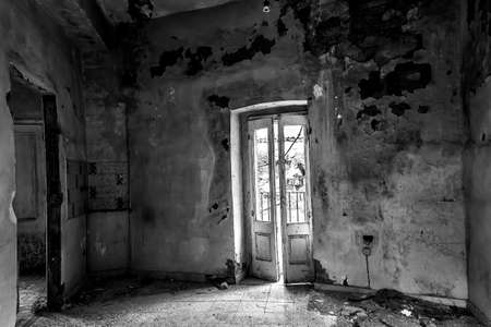 Interior of a dirty an empty demolished abandoned room with broken furniture, open window and demolished fireplace.