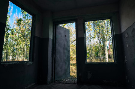view of the forest from a room with windows and a door of an old abandoned house in Ukraine after the war