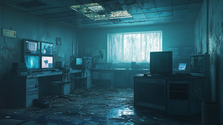 A dimly lit, abandoned room features outdated electronics and debris strewn across the floor.