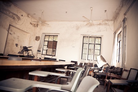 Abandoned building. Broken windows and peeled walls of an historical building. Spooky places concept.