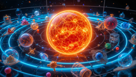 A stunning cosmic scene featuring a luminous sun at the center, surrounded by orbiting planets. This illustration captures the beauty of space and celestial mechanics.