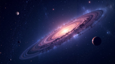 Bright planets orbit around a colorful galaxy illuminated by the warm glow of a nearby sun. Stars twinkle in the dark expansion of space creating a mesmerizing cosmic scene.