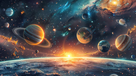 Planets aligning in outer space, orbiting around a brilliant star, create a stunning cosmic vista filled with vibrant colors and celestial wonders