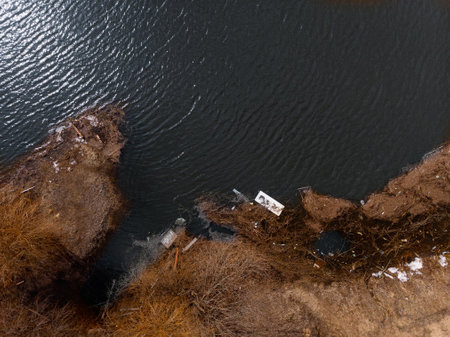 Thickets, meadows on the shores of the lake, aerial view, photo from a drone.