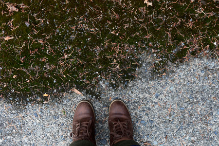 Autumn background top view. Man stands on a wet asphalt covered with fallen yellow leaves, pov