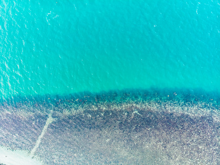Aerial top view of clear turquoise ocean water with reefs. Nature summer background