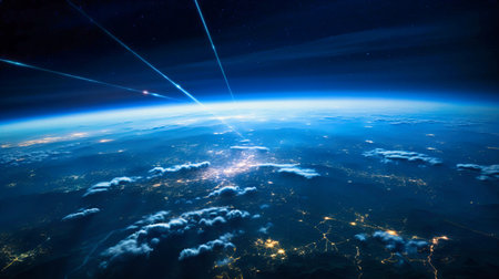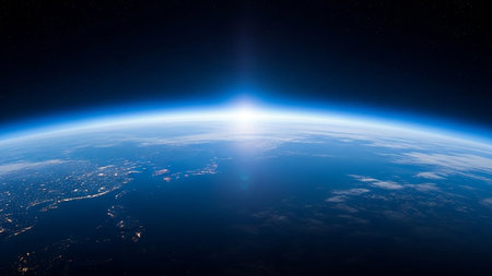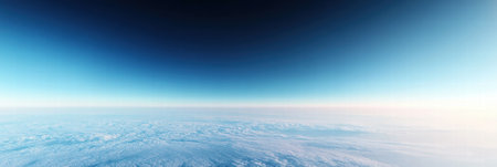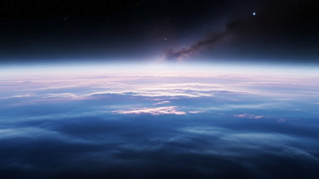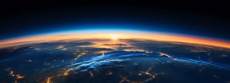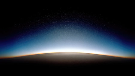 Capture the breathtaking beauty of Earth's horizon against a starry sky at dusk, showcasing a gradient of colors from blue to orange and the vastness of space.