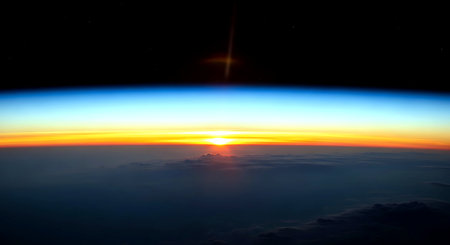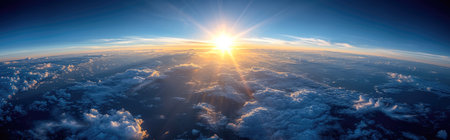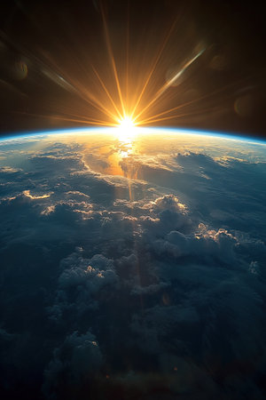 A breathtaking view captures the sun rising above the horizon of Earth with gentle rays filtering through clouds showing the beauty of space and our planet.